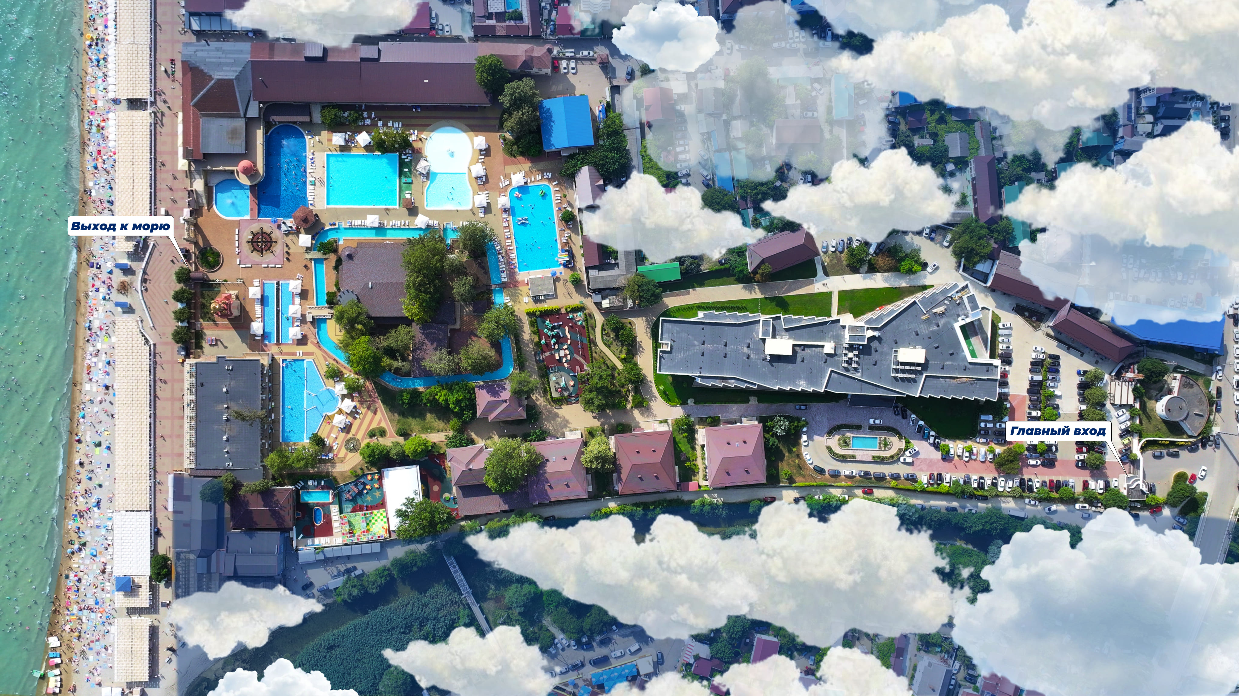 Спускаясь по улице Пограничная, вы доезжаете до поворота налево на Пионерский переулок. По этому переулку проезжаете мимо ресторана «Роза Ветров» по правую сторону, далее мимо Аквапарка по левую сторону.