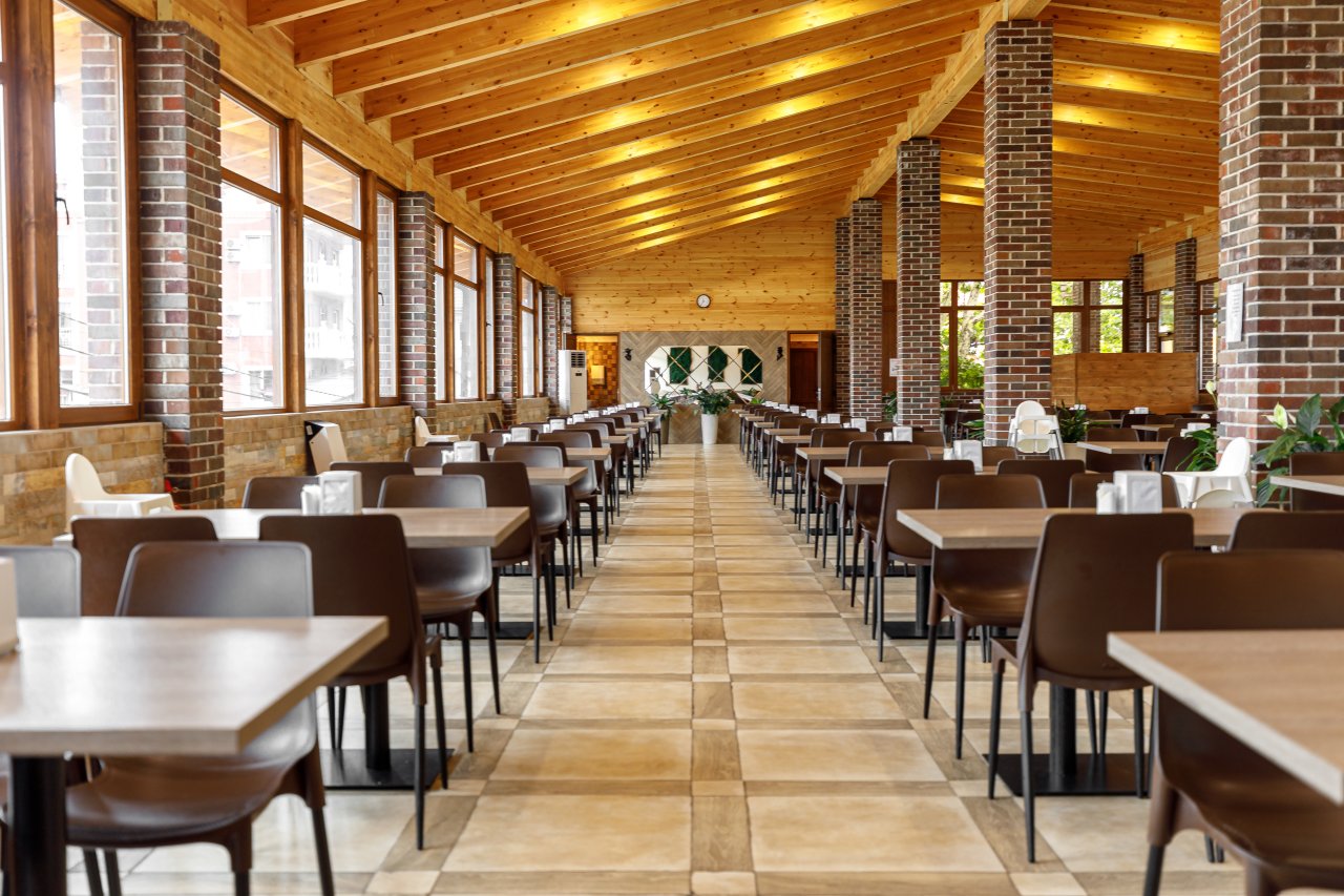 Завтраки, обеды и ужины проходят в уютном зале. Теплый интерьер просторного помещения создает расслабленную атмосферу, а красивые виды из окон придают особенный черноморский колорит.
