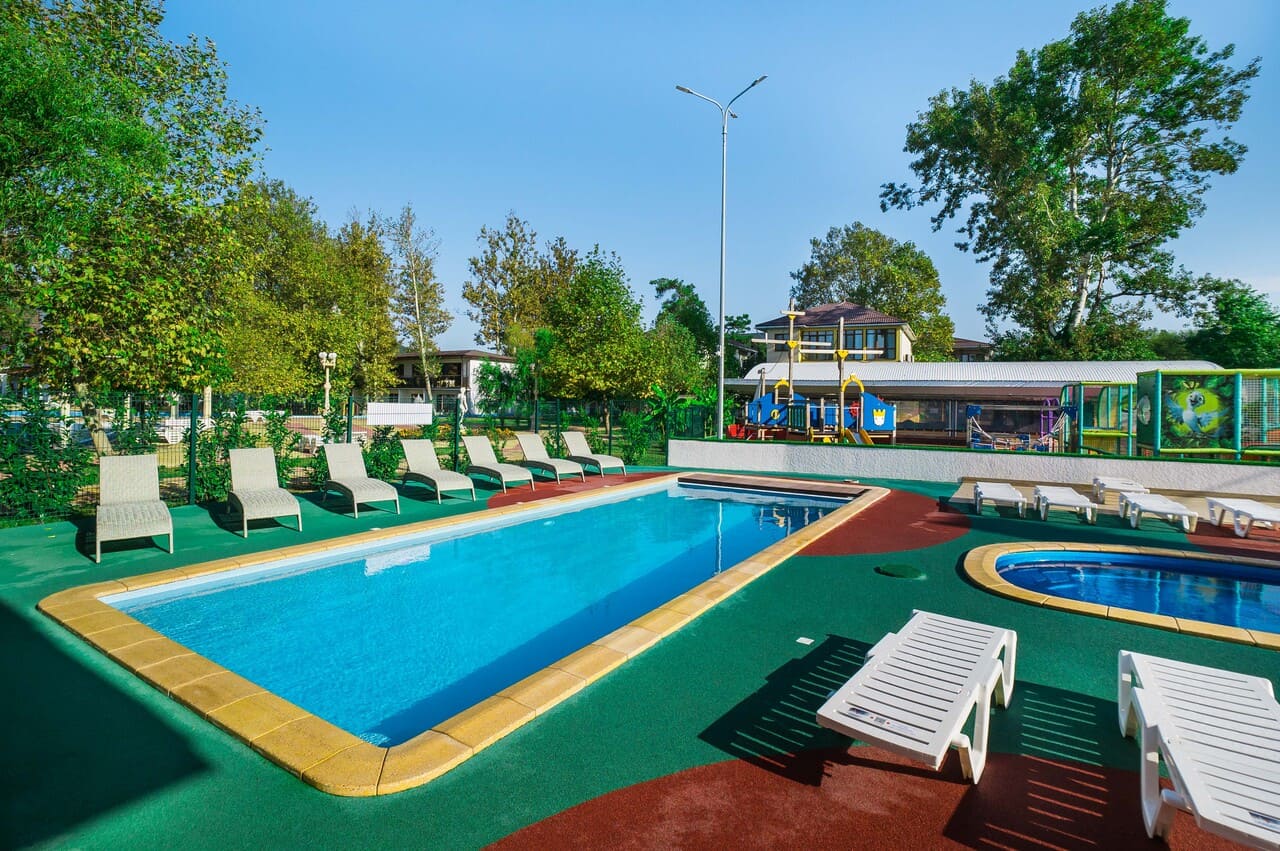 На территории нашего спа-центра в корпусе «Камчатка» есть два подогреваемых бассейна (взрослый и детский), где можно освежиться после тепловых процедур. Вода в них всегда теплая — не отказывайте себе в удовольствии в любую погоду. У бассейнов установлены удобные шезлонги — расслабляйтесь и наслаждайтесь солнцем в размеренном ритме.